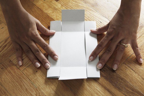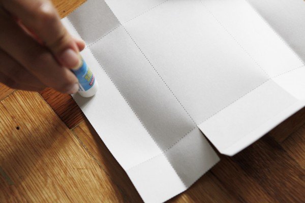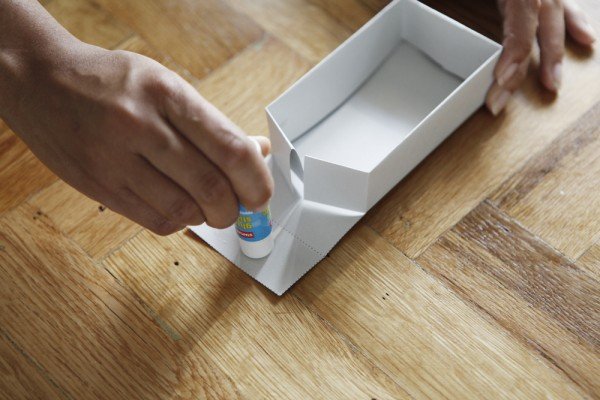 Step three: Fold and glue long side of box up first. Fold and glue shorter sides of box to fold over flap ends of long sides.