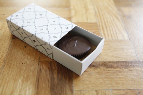 Step five: Slide top of box onto the bottom. Should fit snugly. Fill it with whatever goodies you want. I made dark chocolate peanut butter cups!