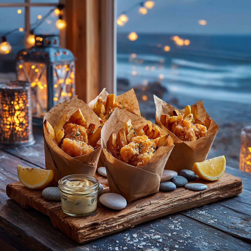 Crisp, sea-salty bites you can eat standing by the “shoreline” (aka the back door). Paper cones, lemon “moons,” and malt-vinegar aioli make them feel seaside-official.